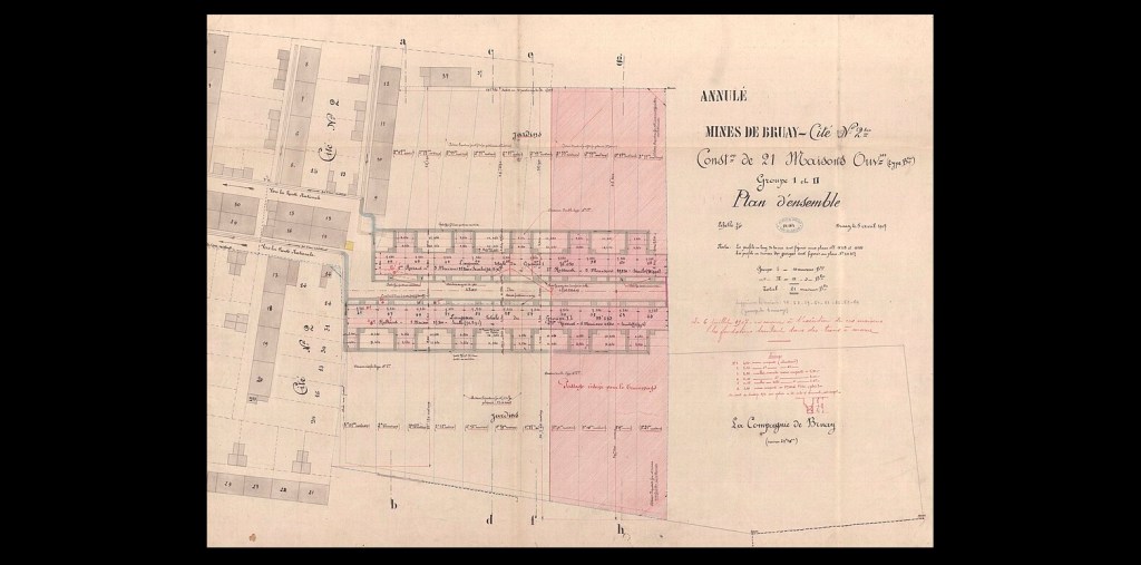 Aanvankelijk ging het in 1856 om zevenendertig woningen, waar er tien jaar later nog zes aan toe werden gevoegd, nu gelegen aan de straten die Rue Marconi en Rue Branly heten. De woningen waren verdeeld over zeven huizenrijen, waarvan zes parallel lagen en loodrecht op nummer zeven stonden. Ze beschikten allemaal over een kleine tuin, zodat de bewoners hun eigen groenten konden verbouwen. Zo konden ze besparen op hun dagelijkse uitgaven en nog iets van hun vroegere agrarische levenswijze in stand houden. Uit kostenoverweging was gekozen voor baksteen en pleisterwerk als bouwmateriaal. In de jaren die volgden creëerden de bewoners gezamenlijk de voorzieningen waar nog behoefte aan was: twee bakhuisjes, een waterput, gemeenschappelijke latrines, konijnenhokken en kippenrennen. Kort na de eeuwwisseling voegde de ‘Compagnie’ daar nog stenen schuurtjes en een wasgelegenheid aan toe. Laatstgenoemde faciliteit was overigens aan strikte regelgeving verbonden. De vrouwen kregen één specifieke dag in de week toegewezen waarop ze in het grote zinken bassin hun was konden doen met het daarvoor benodigde kokend water. Daarbij was een toezichthouder aanwezig, die daarnaast ook onaangekondigd huiscontroles verrichtte. Een waterleidingnet voor stromend water in iedere woning zou pas in de jaren vijftig worden aangelegd.