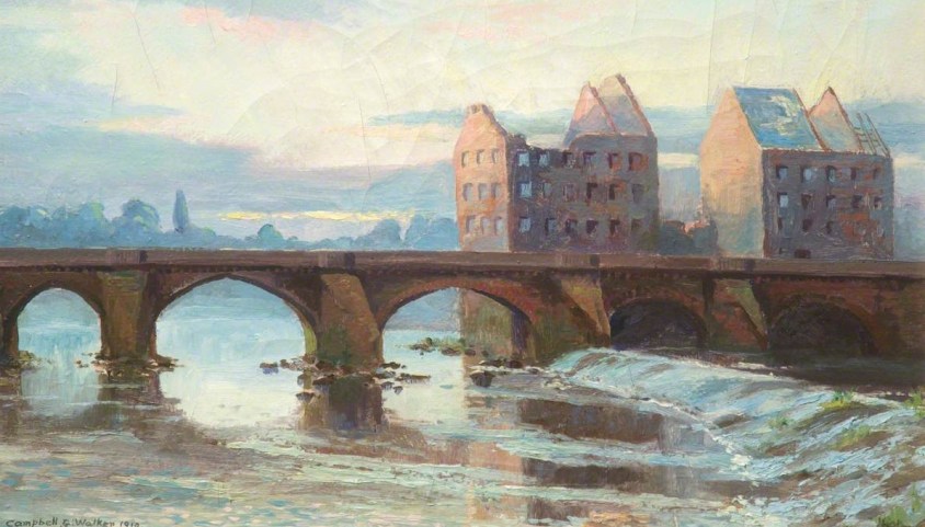 Afbeelding 3: Beide molenhuizen van de Dee Mill, geschilderd door Campbell Gregory Walker tijdens de sloop in 1910.