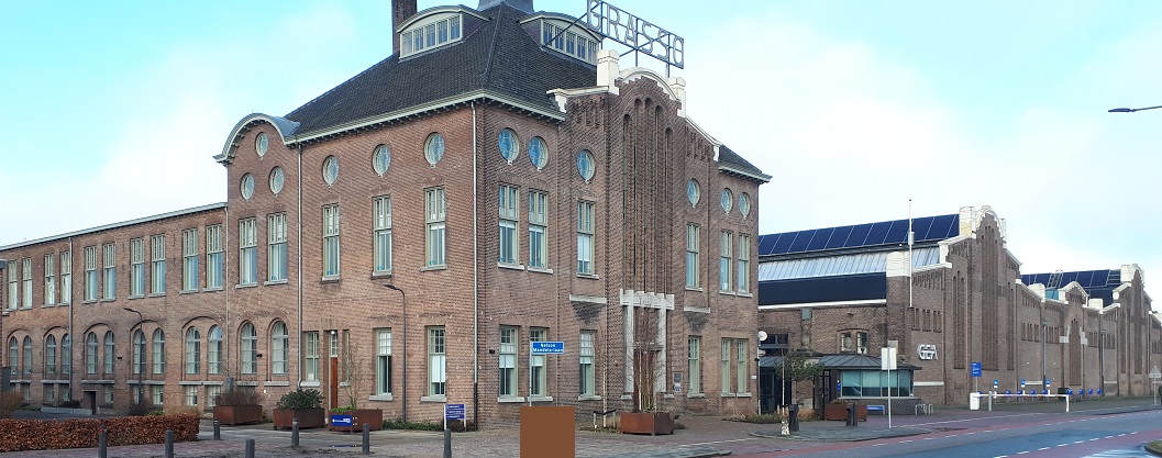 Afbeelding 1: Directiegebouw, toegangspoort en machinehal van het Grasso-fabriekscomplex uit 1913 aan de parallelweg. Naast de oorspronkelijke bedrijfsnaam op het directiegebouw is ook die van het Duitse moederbedrijf GEA zichtbaar.