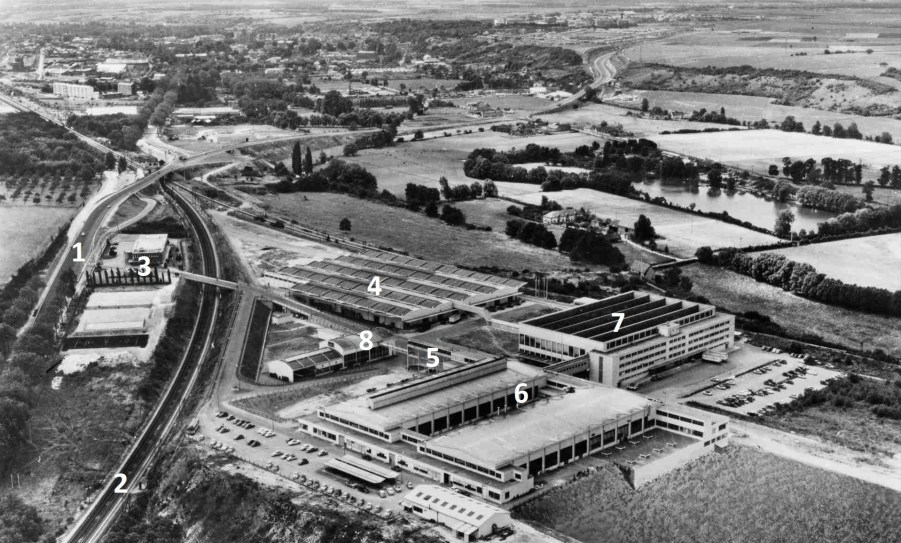 Afbeelding 5: Luchtopname uit 1960 met de RN12 (1), spoorlijn Parijs-Granville (2), pavillon medico-social (3), televisiemagazijn (4), componentenmagazijn (5), beeldbuisfabriek (6), televisietoestellen-fabriek (7) en ketelhuis (8).