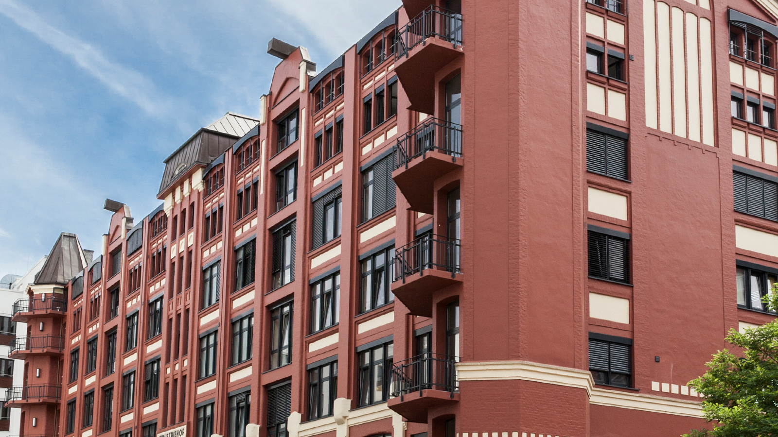 Afbeelding 1: Het voormalige fabriekspand van C.H.F. Müller in Hamburg Hammerbrook. Na renovatie is het herbestemd als appartementengebouw (‘Industriehof’) met een Italiaans restaurant (‘Alitalia’) op de begane grond.