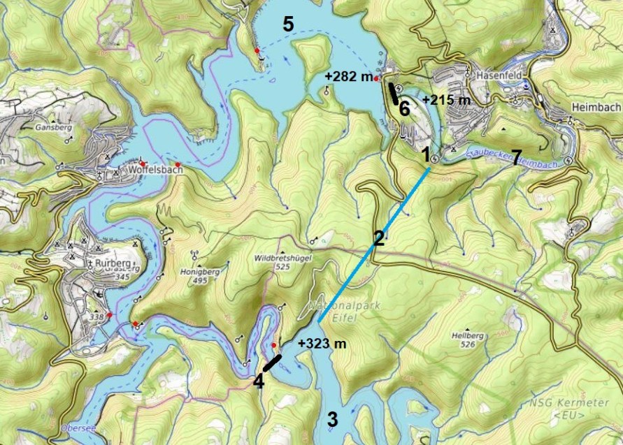 Afbeelding 2: Het Wasserkraftwerk Heimbach (1) krijgt zijn water via een kanaal (2) door de Kermeter-heuvelrug aangevoerd vanuit de Urftsee (3). De Urfttalsperre (4) kwam gereed in 1904, de Rurtalsperre (6) pas in 1938, waardoor de Rurstausee (5) en het Staubecken Heimbach (7) ontstonden.