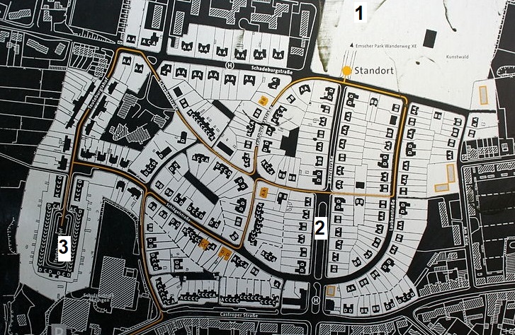 Afbeelding 4: Plattegrond van de Siedlung met de gelijknamige Zeche (1), de centrale Baarestrasse (2) en de Teutoburgiahof (3).