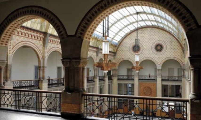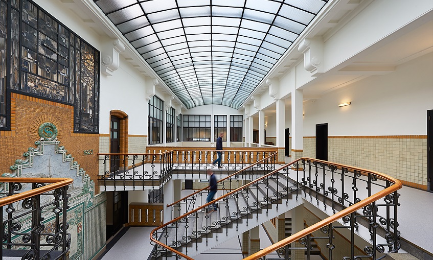 Afbeelding 6: De centrale hal van het voormalige hoofdkantoor van de Nederlandsche Gist- & Spiritus Fabriek in Delft uit 1907. Het fabriekscomplex is tegenwoordig in gebruik door chemiebedrijf DSM, het kantoor wacht als rijksmonument op een nieuwe bestemming.
