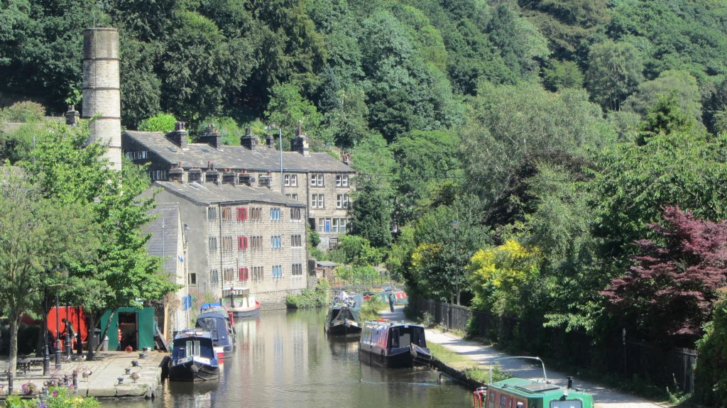 Afbeelding 2: Dankzij de aanleg van het Rochdale Canal in 1804 kon Hebden Bridge in West-Yorkshire uitgroeien tot een centrum van wolweverijen, dat bekend kwam te staan als ‘Trouser Town’. De narrowboats die er tegenwoordig aanleggen zijn omgebouwd voor de pleziervaart.