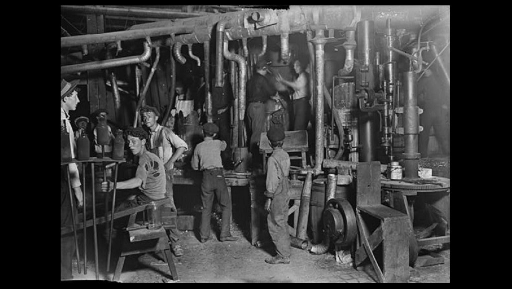 Afbeelding 4. Flessenfabricage in een glasblazerij in de staat Indiana, gefotografeerd door Lewis W. Hine in 1908.