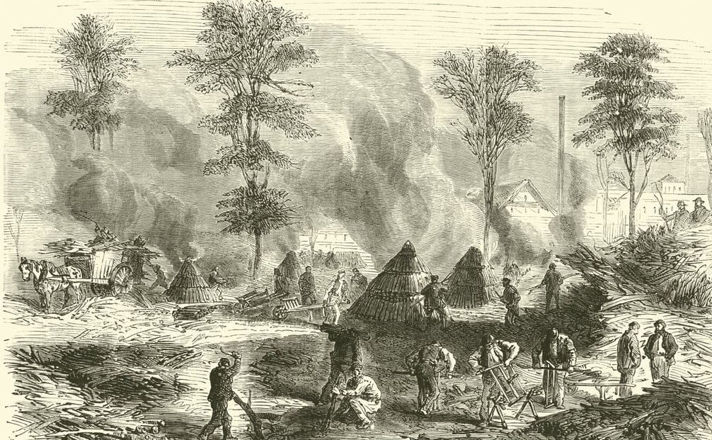 Afbeelding 2: Houtskool diende eeuwenlang als brandstof voor ijzersmelterijen en glasblazerijen en de productie ervan in zogenaamde ´meilers´, zoals hier afgebeeld, leidde tot ernstige ontbossing.