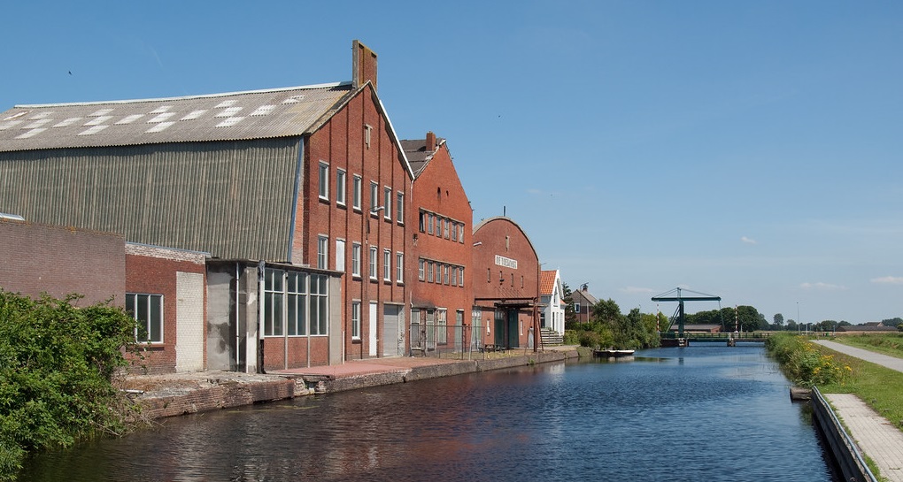 Afbeelding 2: De coöperatieve strokartonfabriek Free & Co. in Oude Pekela was van 1904 tot 1980 actief aan het Pekelderdiep. Nu is een deel van de gebouwen in gebruik bij de firma HempFlax die er hennep verwerkt tot vezels voor de productie van vloermatten, textiel en isolatiemateriaal.