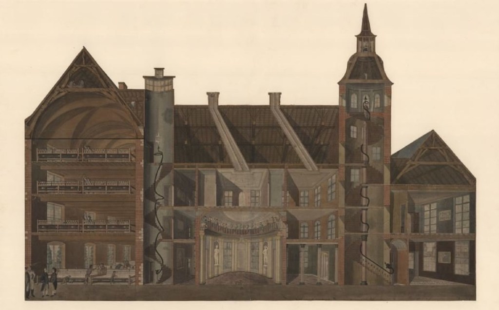 Afbeelding 4: Dwarsdoorsnede van het Gentse Kartuizerklooster uit 1808 waarop de spinnerij te zien is die textielfabrikant Lieven Bauwens er tien jaar eerder in ondergebracht had.