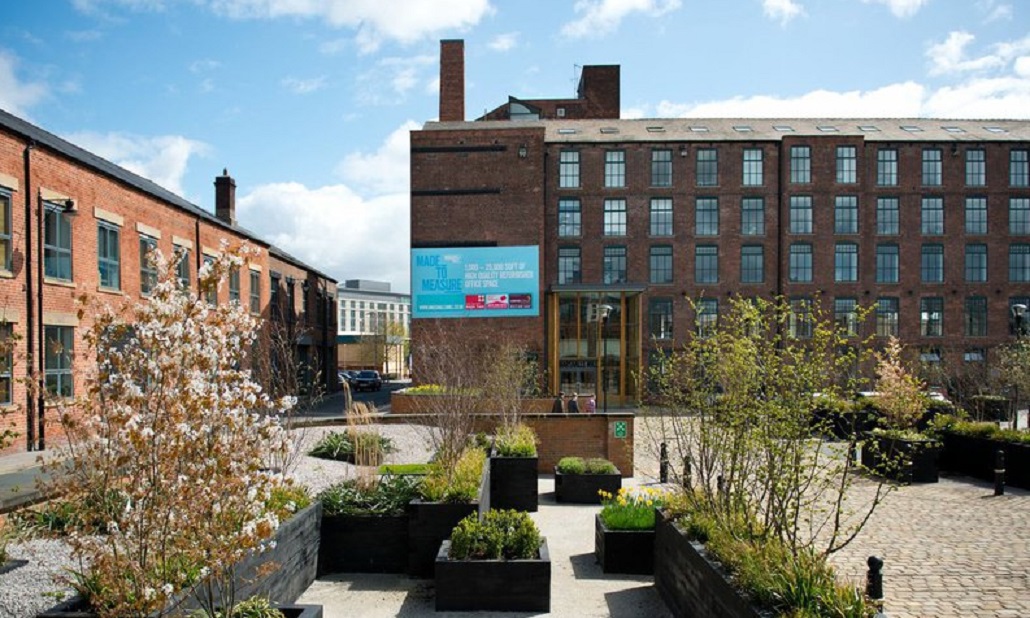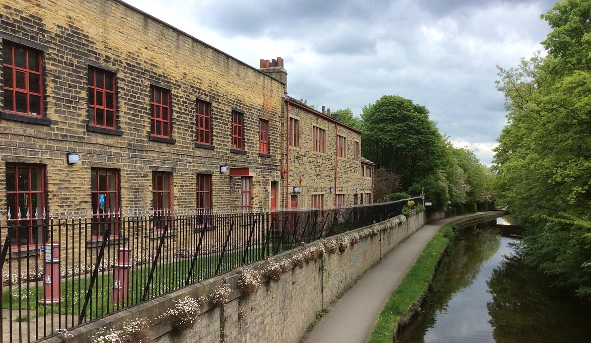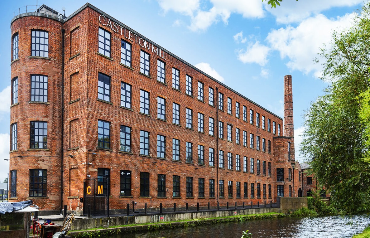 Afbeelding 1: Castleton Mill, gelegen aan het Leeds Liverpool Canal, kwam in 1836 in gebruik als vlasspinnerij en werd in 1850 uitgebreid met een linnen- en wolweverij. Na toekenning van de monumentenstatus in 1987 en renovatie in 2013 zijn er nu kantoorruimtes voor creatieve ondernemers in ondergebracht.