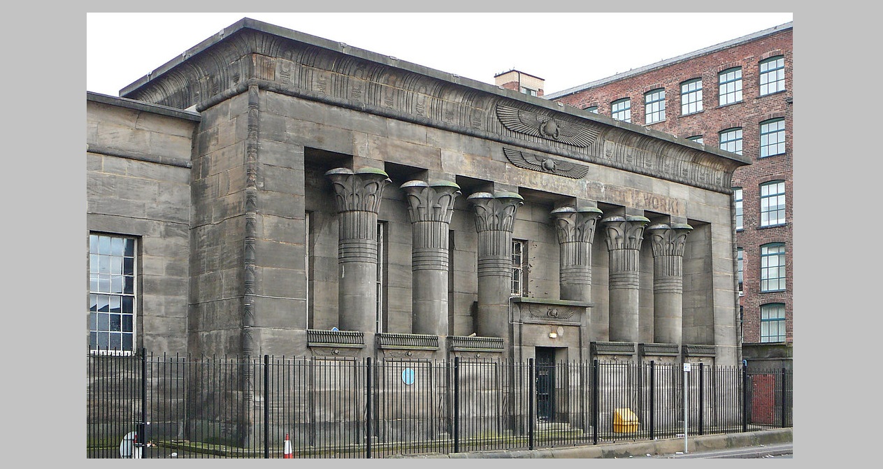 Afbeelding 6: In 1836 liet John Marshall een fabriek bouwen met een Egyptische zuilengalerij als façade die de toepasselijke naam ‘Temple Works’ kreeg. Na restauratie deed het gebouw vanaf 2009 tijdelijk dienst als kunstencentrum. Rechts op de achtergrond Marshall’s Mill.