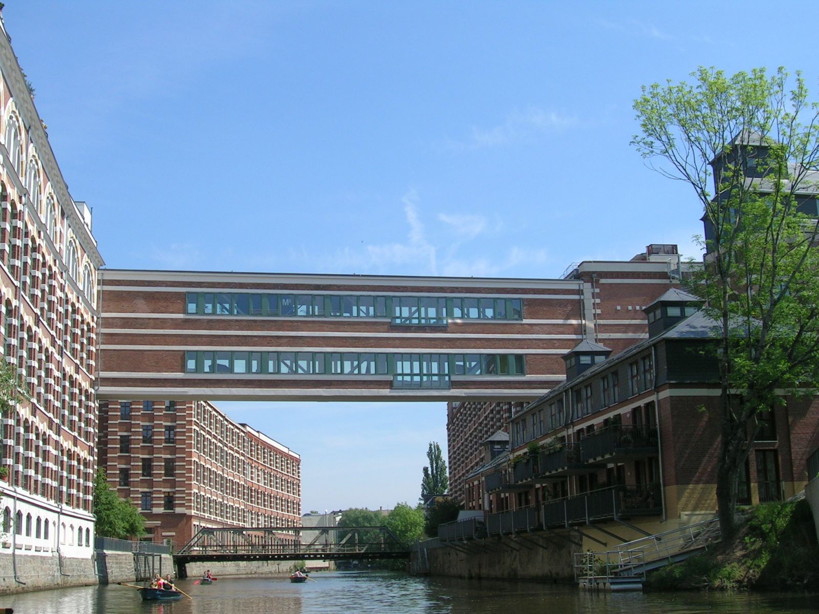 Afbeelding 5: De Sächsische Wollgarnfabrik, nu bekend als de ´Elsterlofts´, gezien vanaf het water van de Weiße Elster, met links Hochbau West (voorgrond) en –Mitte en rechts het filtergebouw, ketelhuis (voorgrond) en Hochbau Süd.