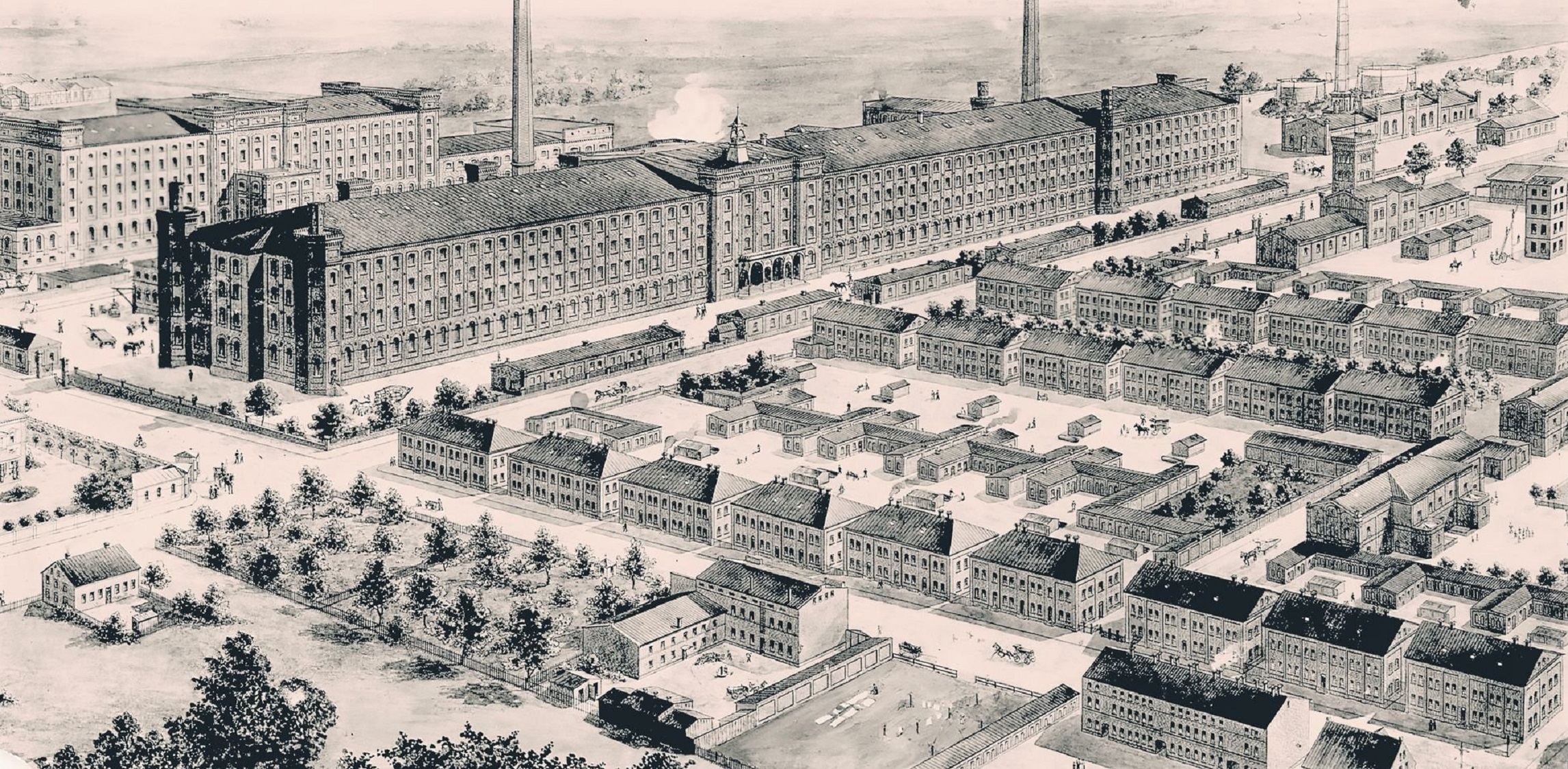 Afbeelding 3: Carl Wilhelm Scheibler liet naast zijn reusachtige spinnerij van ‘Ksiezy Mlyn’ een woonwijk bouwen voor zijn beambten, opzichters en geschoolde arbeiders.