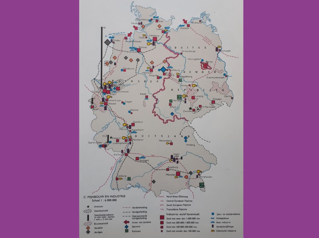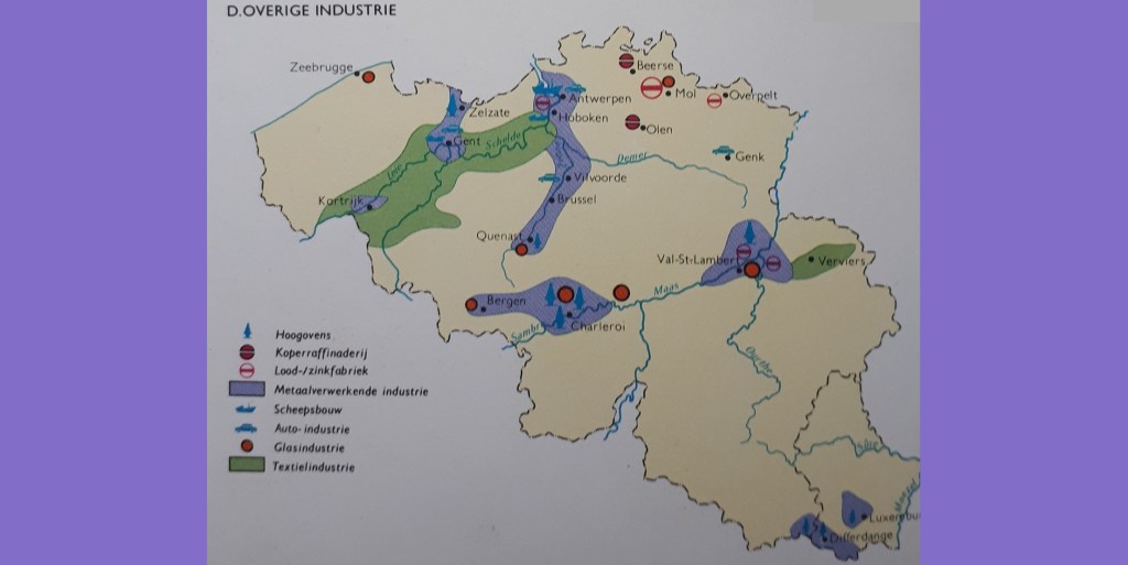 Ooit was het een vast onderdeel van iedere schoolatlas, of hing ze zelfs op groot formaat aan de wand van het klaslokaal: de industriekaart. Een thematische kaart waarop met symbolen de verschillende industriesectoren stonden aangegeven, vaak in combinatie met bodemschatten en infrastructuur. Doorgaans waren ze afgedrukt tussen andere thematische kaarten, zoals die met landbouw, toerisme, bevolkingsdichtheid, waterhuishouding, klimaat, etc. Eenvoudige symbolen gaven de gebieden aan waarin de textiel-, metaal- en chemische industrie waren geconcentreerd, arceringen die waar zich steenkool, olie of zout in de bodem bevond. Wie tegenwoordig door een atlas bladert zal er vergeefs naar zoeken. Het kaartmateriaal is alsmaar mooier en uiteenlopender geworden, maar de industrie als thema ontbreekt of is enkel nog onderdeel van een kaart met alle mogelijke economische activiteiten. Dat is overigens geen recente ontwikkeling. De laatste wandkaart van Nederland met industrie als thema dateert uit begin jaren zeventig en in de loop van de jaren tachtig verdwenen ze ook uit de atlassen. Wie verwacht een dergelijke kaart nog in een historieatlas aan te treffen, komt ook bedrogen uit. Want hoewel industrie in West-Europa inmiddels grotendeels tot het verleden behoort, garandeert dat nog allerminst dat er aandacht aan wordt besteed in een dergelijk naslagwerk, hoewel de sector toch een eeuw lang onmiskenbaar zijn stempel drukte op samenleving en landschap. Reden dus om er op deze website, en binnen deze rubriek in het bijzonder, wél aandacht aan te besteden. De getoonde kaarten zijn allemaal afkomstig uit schoolatlassen die eind jaren zeventig werden uitgebracht. Ze zullen per land (Benelux & Buurlanden) kort besproken worden, waarbij de nadruk ligt op de historische achtergrond van de getoonde industriegebieden en hun relatie met bodemschatten en infrastructuur.