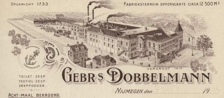De eerste vermelding van zeepproductie in de Nijmeegse archieven dateert uit 1733 en heeft betrekking op de broers Abraham en Jacob Mist. Zij vestigden zich toen, na enig protest van een nabijgelegen brouwerij, in de benedenstad met het alleenrecht om er twaalf jaar een zeepziederij te bedrijven. Deze kwam bekend te staan onder de naam ‘Het Anker’, wat mogelijk een verwijzing was naar de scheepvaart op de Waal. Na een aantal maal van eigenaar te zijn verwisseld kwam de onderneming in 1854 in handen van Johann Peter Dobbelmann. Hoewel er nog maar zeven werknemers in dienst waren, beschikte het bedrijf reeds over een stoommachine en had daarmee de primeur in de Waalstad. De jaarproductie van de fabriek bedroeg enkele honderden tonnen zachte zeep die onder de merknaam ‘Anker’ op de markt werd gebracht. Het was overigens niet het eerste bedrijf van Dobbelmann. In 1828 was hij vanuit het Duitse Siegburg naar Nederland gekomen en had zich na zijn huwelijk met de dochter van een Maastrichtse architect in Nijmegen gevestigd. Hij kreeg er al snel een vergunning verleend voor een likeurstokerij, maar werd actief als koopman in tabak met zijn initialen als merknaam: J.P.D. Dat zijn familie in Duitsland een koloniaalwarenhandel had zal hierbij vermoedelijk de doorslag hebben gegeven. Later begaf hij zich wel buiten de traditionele paden, wat niet alleen blijkt uit de overname van de zeepfabriek, maar ook uit de oprichting van de Geldersche Stoomboot Maatschappij in 1852, die een lijndienst ging onderhouden tussen Emmerich en Schiedam. Deze belangstelling voor het welvaren van zijn woonplaats maakte hem ook tot een pleitbezorger voor de aansluiting van Nijmegen op het spoorwegnet en uiteindelijk, na zijn naturalisatie tot Nederlander, lid van de gemeenteraad.