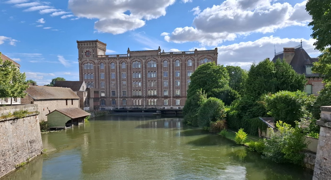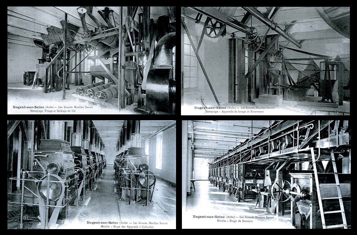 De Seinevallei rond Nogent, zo’n honderd kilometer stroomopwaarts van Parijs, is van oudsher een gebied waar graan geteeld én verwerkt wordt. Hier bevonden zich ooit veertien watermolens waarvan de raderen werden aangedreven door de Seine en haar zijrivieren Ardusson, Noxe en Orvin. Dankzij samenvloeiing met de Aube, even ten oosten van Nogent, was de bevaarbaarheid van de Seine vanaf hier goed genoeg om een groot deel van het jaar het geproduceerde meel per schip naar Parijs te vervoeren. Tenminste, als de molenaars genoeg water doorlieten om de Seine op diepte te houden, want juist op dat vlak botste hun belang regelmatig met dat van de schippers. De opkomst van de spoorwegen beslechtte dit conflict in het voordeel van de molenaars. Omdat vanaf toen de rol van de rivier als waterweg drastisch terugliep konden zij hun molens sterk uitbreiden en zo uitgroeien tot meelfabrikanten. Dat gold voor de molens in Mery-sur-Seine, Romilly-sur-Seine (Moulins de la Montois en Grands Moulins Raverdau) en Saint-Hillaire-sous-Romilly (Moulins de Faverolles), maar in het bijzonder voor de die van de gebroeders Sassot in Nogent. Hun ‘Grands Moulins de Nogent-sur-Seine’, die tot op de dag van vandaag behouden is gebleven, vertoont veel gelijkenis met de katoenspinnerijen die destijds naar voorbeeld van het Engelse Lancashire door heel Europa gebouwd werden. Nadat hun molen in 1907 door brand was verwoest lieten ze een nieuwe, moderne maalderij ontwerpen, voorzien van een toren met bovenin een bluswaterreservoir, net zoals dat in de ‘licht ontvlambare’ textielfabrieken toen al langere tijd gangbaar was. Het gebouw verrees in een recordtijd van zeven maanden en bleef daarna voor catastrofes gespaard. Over ‘tijd’ gesproken: die werd sindsdien aangegeven door een uurwerk in de toren. Net zoals de textielarbeiders op die manier gedwongen werden om op tijd aan hun weefstoelen te verschijnen, zo hadden de werknemers van de ‘Grands Moulins’ geen excuus meer om zich te laat bij hun maalstoelen te melden.