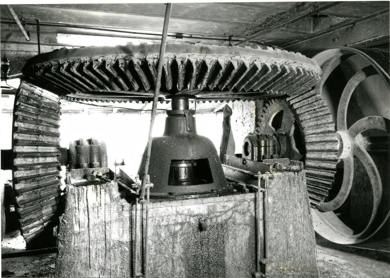 Afbeelding 2: Overbrenging van de waterkracht op de installaties van de meelfabriek via een tandwielconstructie.