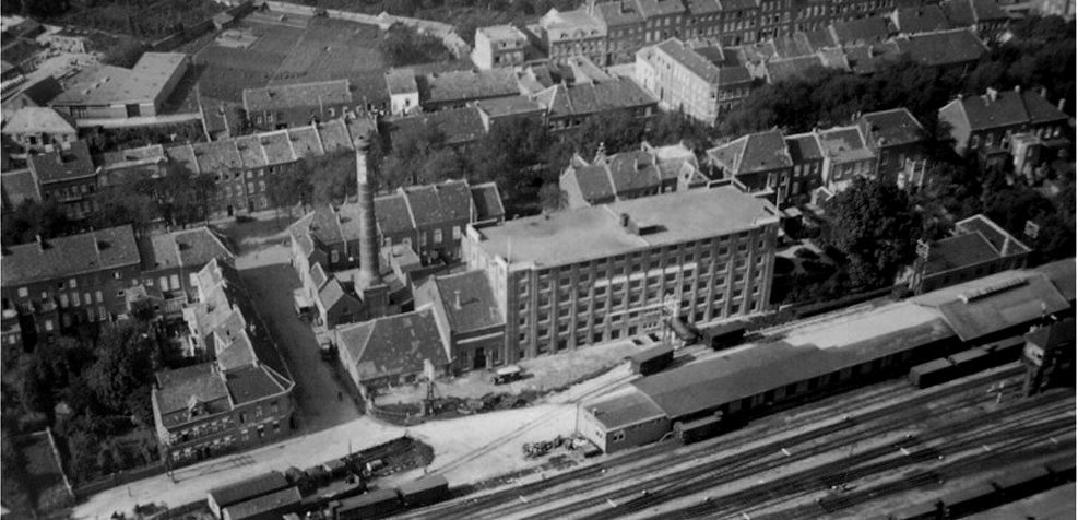 Afbeelding 4: Luchtopname van de maalderij uit 1925 die toen in gebruik was als rijwielfabriek. Hierop is duidelijk zichtbaar dat het pand over een eigen spoorwegaansluiting beschikte. De loodsen aan het hoofdspoor behoorden toe aan Van Gend & Loos. In het lage pand met zadeldak dat links aan de maalderij grenst was koffiebranderij BACO gehuisvest.