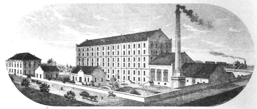 Afbeelding 2: De stoommeelfabriek in haar beginjaren, gezien vanaf de stadszijde met de spoorlijn op de achtergrond.