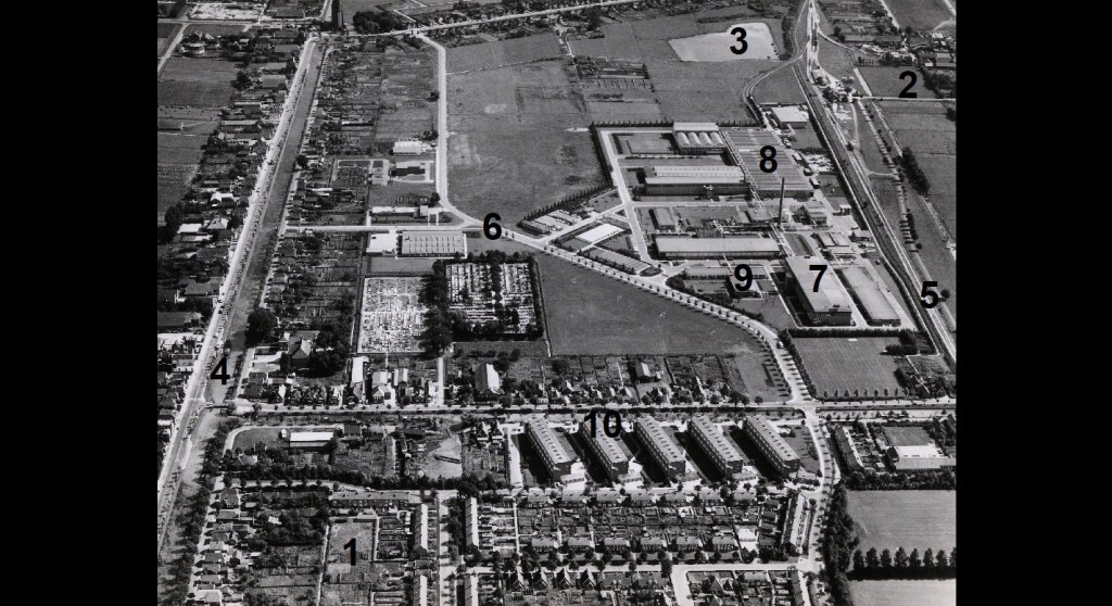 Afbeelding 4: Luchtopname in zuidelijke richting met Stadskanaal (1), Nieuw-Buinen (2), het Ceresmeer (3), het kanaal (4), de spoorlijn van de STAR (5), Electronicaweg (6), halfgeleiderfabriek (7), beeldbuizenfabriek (8), kantoren & kantine (9) en de Philipsflats (10).