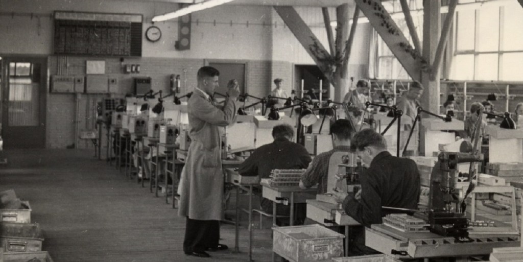 Afbeelding 1: In de eerste bedrijfshallen van Philips aan de Vledderweg werden relaisschakelingen voor telefooncentrales geassembleerd.