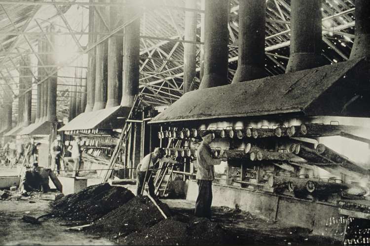Afbeelding 4: In de zinkfabriek waren tientallen reductieovens samengebracht in batterijen die door enkele arbeiders gevuld en afgetapt werden.