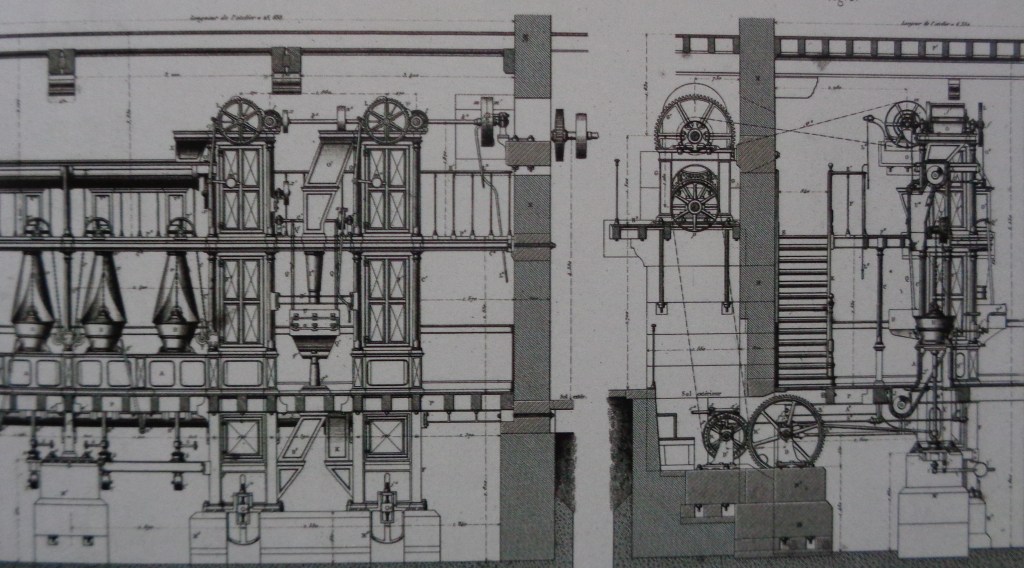 Afbeelding 4: Constructietekening van de grote raspmolens in vleugel B, waarin drie etages waren aangebracht die via trappen (zie rechts) bereikt konden worden.