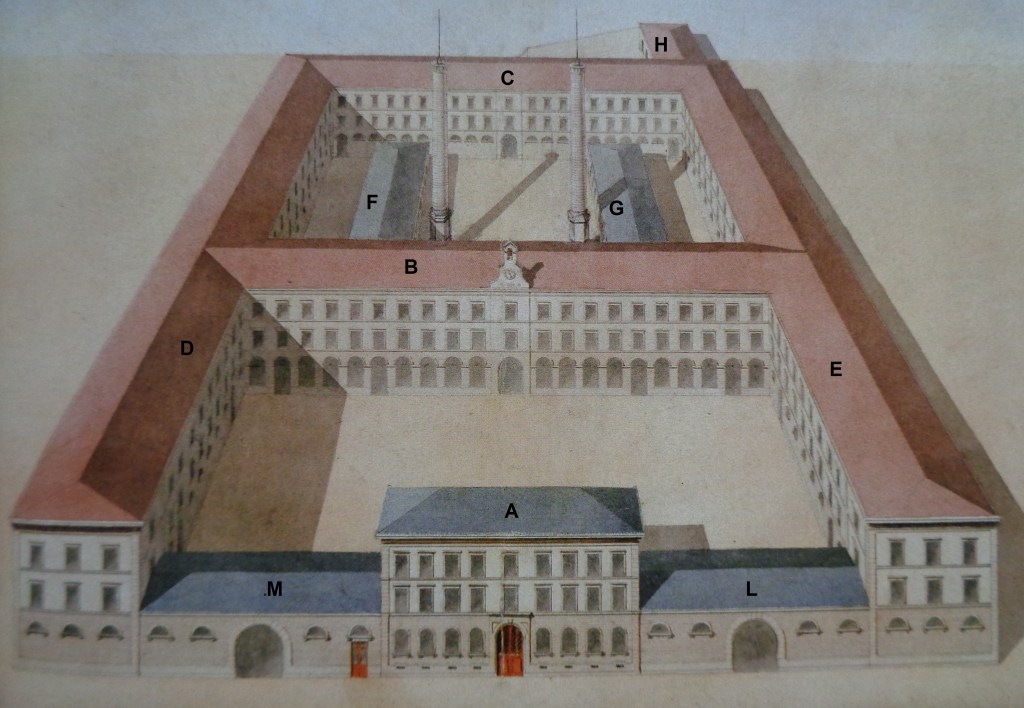 Afbeelding 3: Ontwerptekening van het complex met het directiegebouw (A), vier vleugels (B t/m E), ketelhuis (F), ovengebouw (G), magazijn (H) en poortgebouwen (L en M).