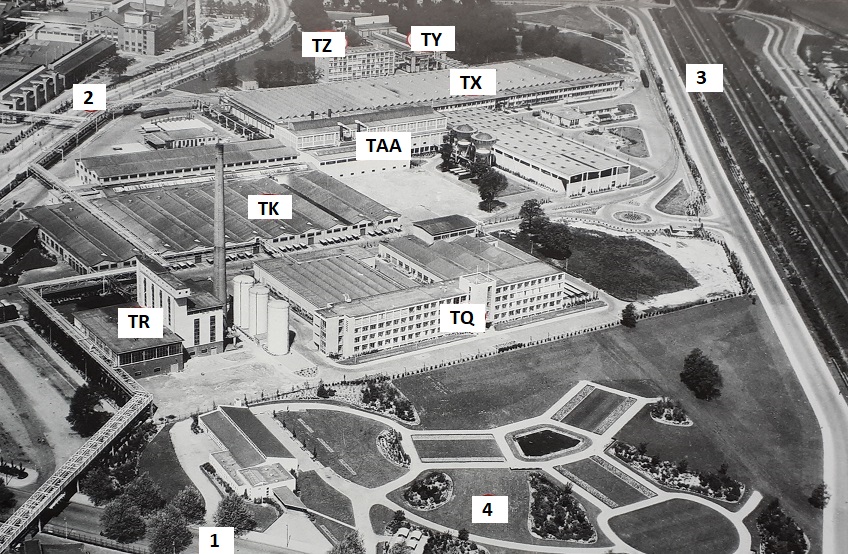 Afbeelding 5: Luchtopname van Strijp T uit de jaren ’50, met op de voorgrond de Beukenlaan (1), links de Zwaanstraat (2) en rechts de spoorlijn naar Den Bosch (3). Gemarkeerd zijn de energiecentrale (TR), Industrial Electronics (TQ), golfkartonfabriek (TK), papierfabriek (TAA), Machinefabrieken (TX), glaslaboratorium (TZ) en proeffabriek (TY).