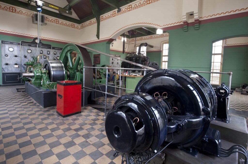 Afbeelding 1: De voormalige elektriciteitscentrale van Veenhuizen, met op de voorgrond een 100 pk Crossley zuiggasmotor (links) met een 100 kW generator van Smit Slikkerveer (rechts) en op de achtergrond een 150 pk Kromhout dieselmotor.