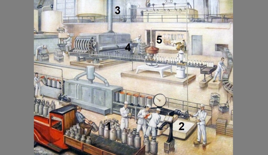 Afbeelding 2: Schoolplaat van een stedelijke melkinrichting, met het lossen van de melkbussen (1), het wegen en nemen van monsters (2), pasteurisatie en opslag (3), verpakking (4) en distributie (5).